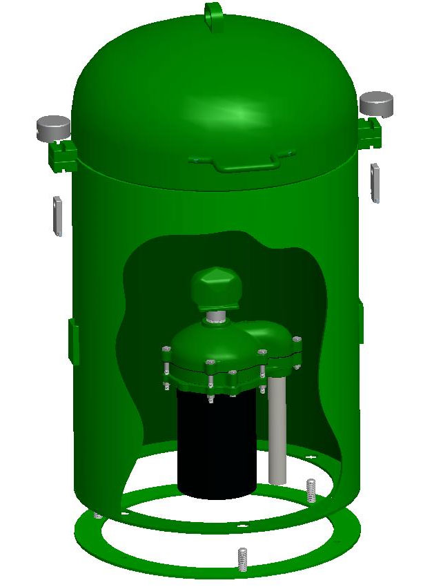 The Watertight Cap shall be secured to the pitless casing with a compression gasket. The top of the cap can be removed without affecting the sealed conduit or wiring. The heavy duty watertight cap will have a separate protected downward facing stainless steel screened well vent with pipe nipple. Construction of the cap and well vent will be of heavy duty gray cast iron and painted with a green enamel finish.